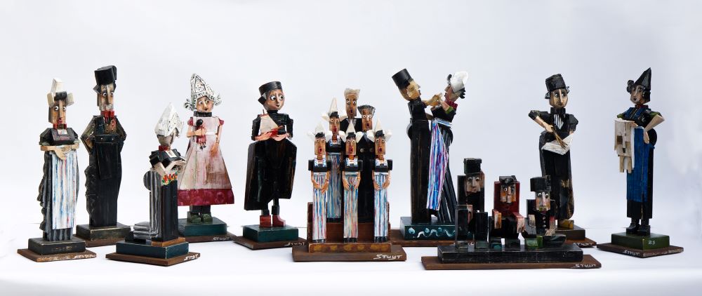 De Volendamse kunstenaar Jan Stuijt maakte van afvalmateriaal een serie van 10 beelden op Volendamse thema’s. Op zijn verzoek schreef Sijmen daar gedichten bij in het Volendams. De beelden zijn te koop via de website van Jan Stuijt. Hieronder volgt het eerste gedicht.